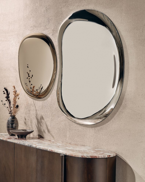 The soft volume of the Pangea mirror captures and reflects the environment that welcomes it, giving it a touch of naturalness and preciousness.