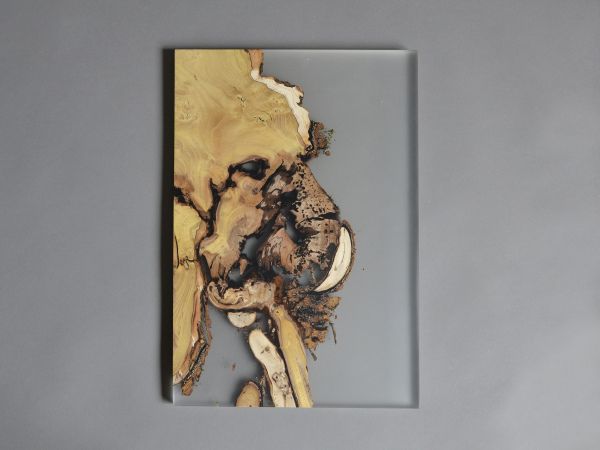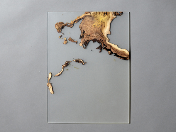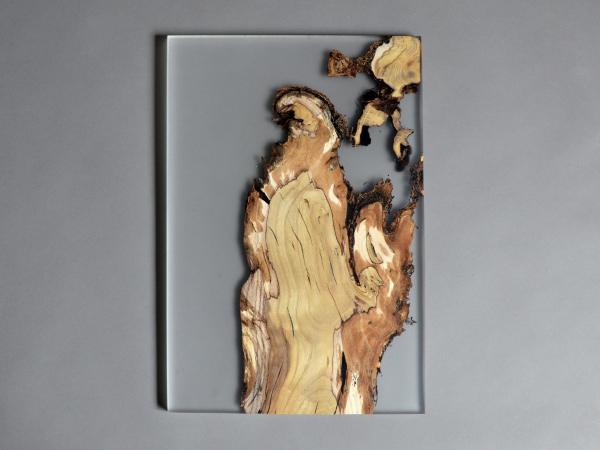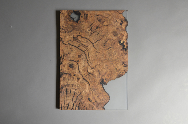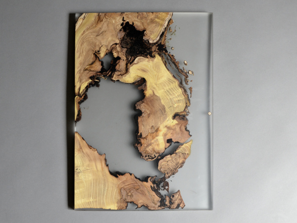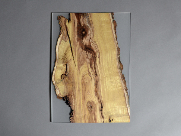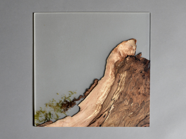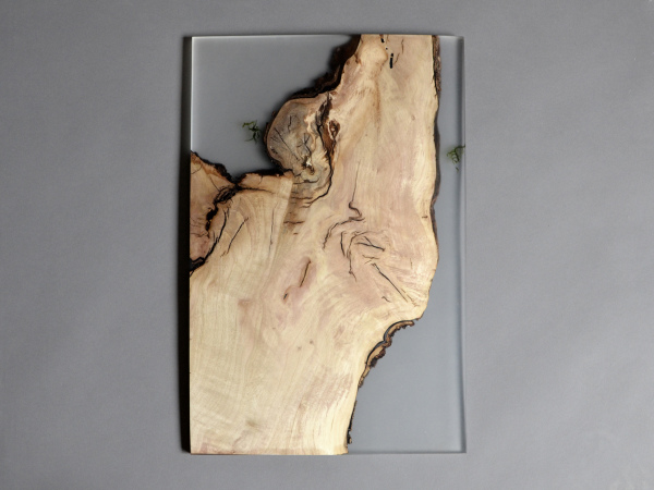 alcarol recovered some logs from the undergrowth of the Italian Dolomite mountains and cut thin slices that preserve the natural wood edges with their native populations of mosses, which are embedded in a translucent resin resembling the water that generated their life.