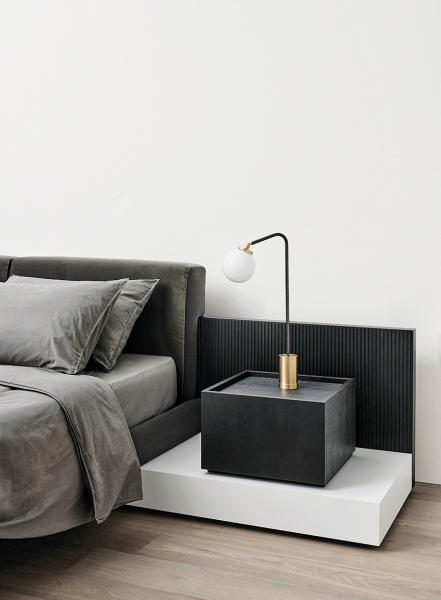 A collection of modular beds, rich and refined in terms of both structure and details: it allows the outmost compositive freedom with its headboards and bases available in a wide selection of dimensions, finishes and accessories. The L-shaped structure is the bed base and supports the headboard: the horizontal panels on both sides of the bed can be used to stack books or to place lamps, or may be completed with one of the many complements. The entire range is about flexibility, even in the finishes: headboard and base can be either manufactured in the same material or with different ones for a visually, extremely rich solution.