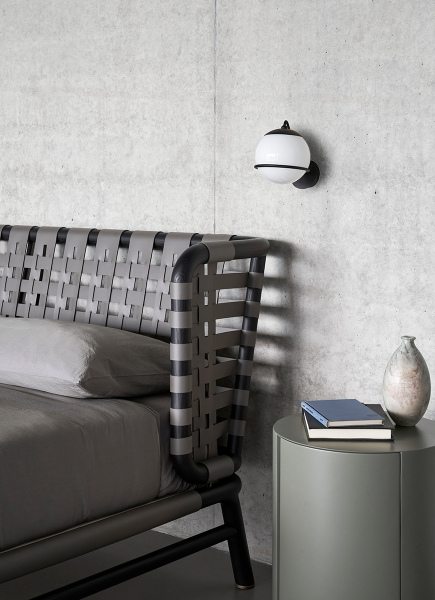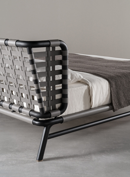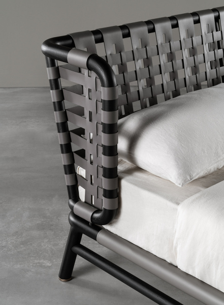 Manual skills and a unique tailoring approach define the Edoardo bed. The essentiality of the solid wood frame plays in a game of contrast with the volumes of the headboard available in three versions, each one with its own personality. The first version is enveloping and sophisticated, upholstered with a textile covering and outlined by a piping; the second one is an invitation to relax with its soft, welcoming allure thanks to the flat ruffles; the third version in woven saddle-leather shows a rigorous but at the same time glamorous look: the complex weaving process combines the utmost care for details with traditional manufacturing skills.