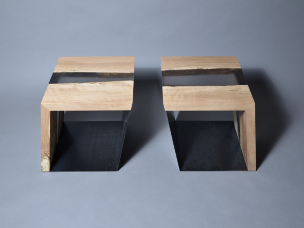 Fungi Inclined Stools are made from a single wood plank, cut into two parts with a very thin blade. The board is held together by the resin leak in the center.