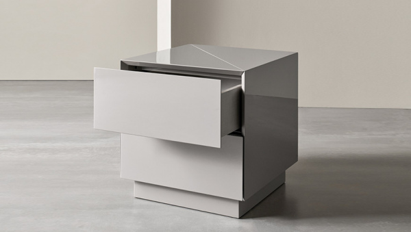 This night table is characterized by the 45° diagonal cut on the upper top and the two drawers. The possibility to combine matt or glossy lacquer finishes allows glamourous and unexpected looks.