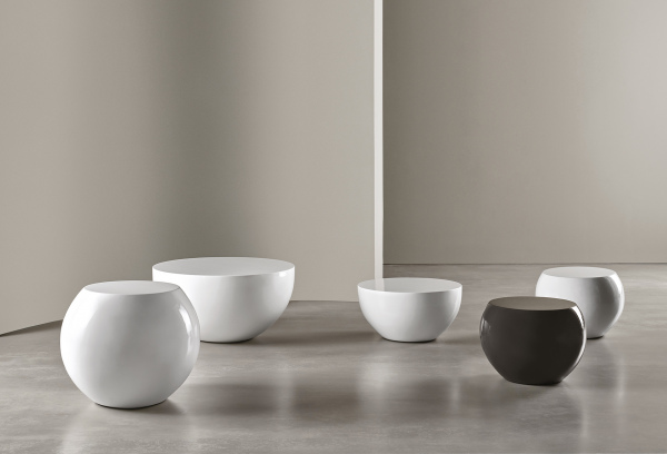 Several variations of a geometrical solid bestow the look of this family of low tables, available in various sizes and in lacquered colours, the matt lacquer being suitable for the outdoor use. A voyage among possible colours and shapes which allows to give life to refined combinations for the structure and the top.
