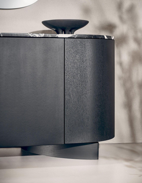 The protagonist element of the Flow sideboard are the wooden bases designed to create an effect of fluidity and dynamism in contrast with the sculptural pride of the wooden container. In this piece of furniture, the search for decorative qualities blends with volumetric purity, which facilitates its insertion in the most diverse spatial contexts. A stylistic choice embellished by the finishes of the top available in marble, wood or ceramic.