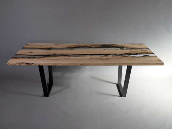 Bricola Solid Oak WOOD, Frosted RESIN - Colorless or Aquamarine - , Burnished STEEL Legs Natural Wood surface not covered by resin on the section planes. Selective wood coating with matt natural effect.